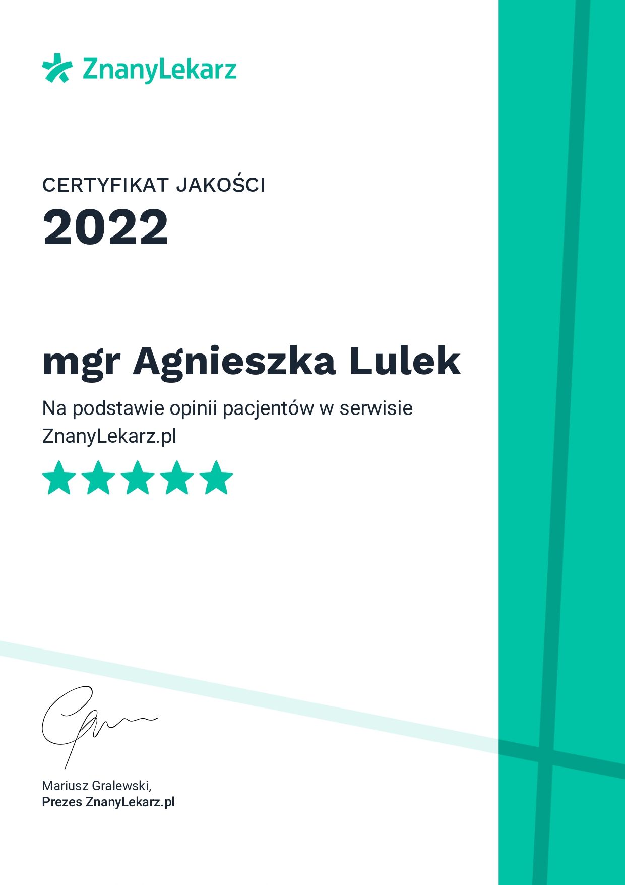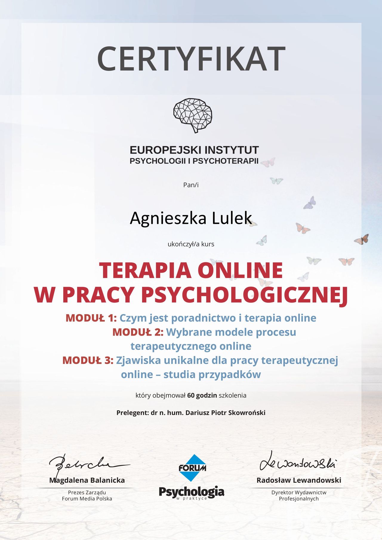 Gdyby nie Agnieszka, nie poradziłabym sobie ze wszystkim, co mnie ostatnio spotkało. Nie mogę się doczekać kolejnych spotkań, bo wiem jak wiele mi dają. Konsultacje online czy przez telefon przebiegają z pełnym zaangażowaniem ze strony Agnieszki - słucha, dopytuje, nie ponagla i nie podpowiada. Jest ze mną w podróży, którą sama sobie wybrałam i lepszego towarzysza nie mogę sobie wyobrazić! Co najważniejsze - jest delikatna, ale przy tym czasami do bólu szczera. To dla mnie naprawdę bardzo istotne, bo nie chcę być „głaskana", tylko docierać do prawdziwych, nieupiększonych sztucznie prawd.